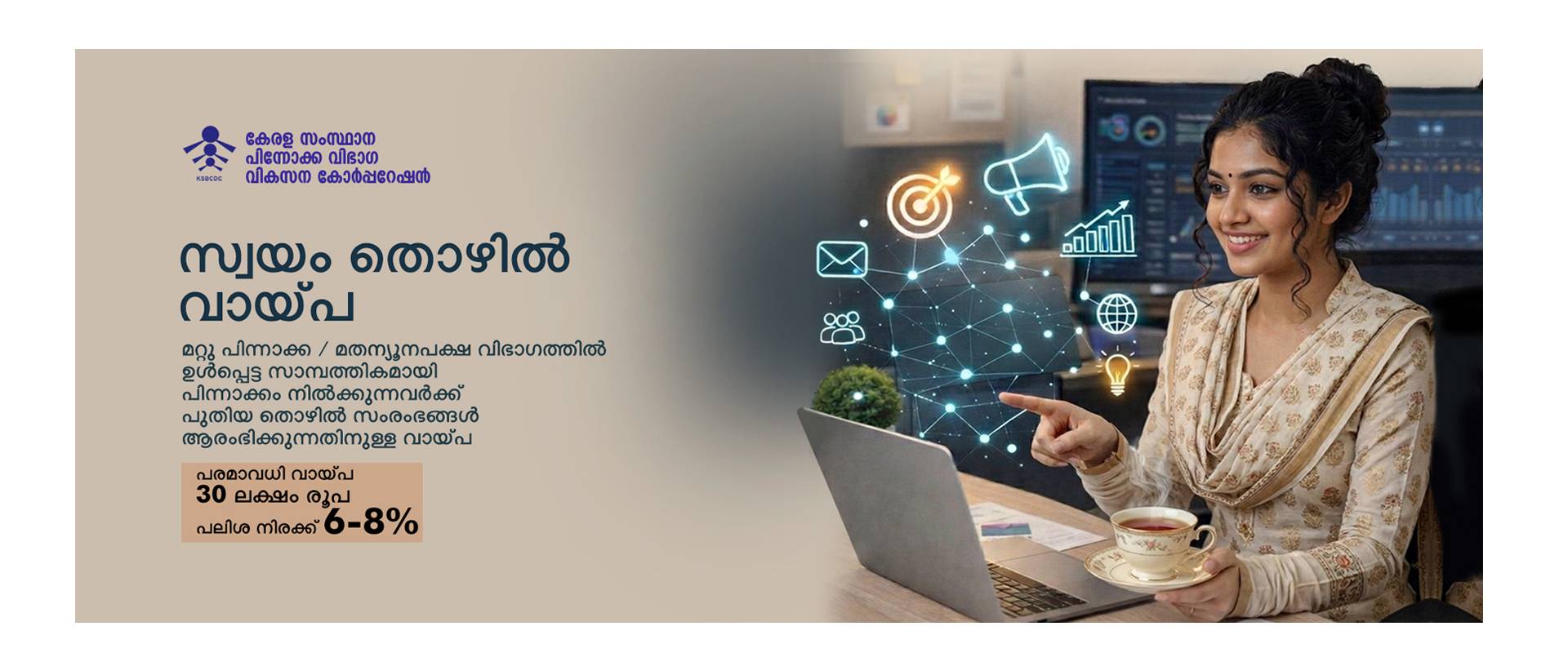 Kerala State Backward Classes Development Corporation Ltd. (KSBCDC) is a Government of Kerala undertaking established on 28 February 1995. Its objective is to promote the economic and social development of targeted communities and achieve “Freedom from Poverty and Backwardness.”